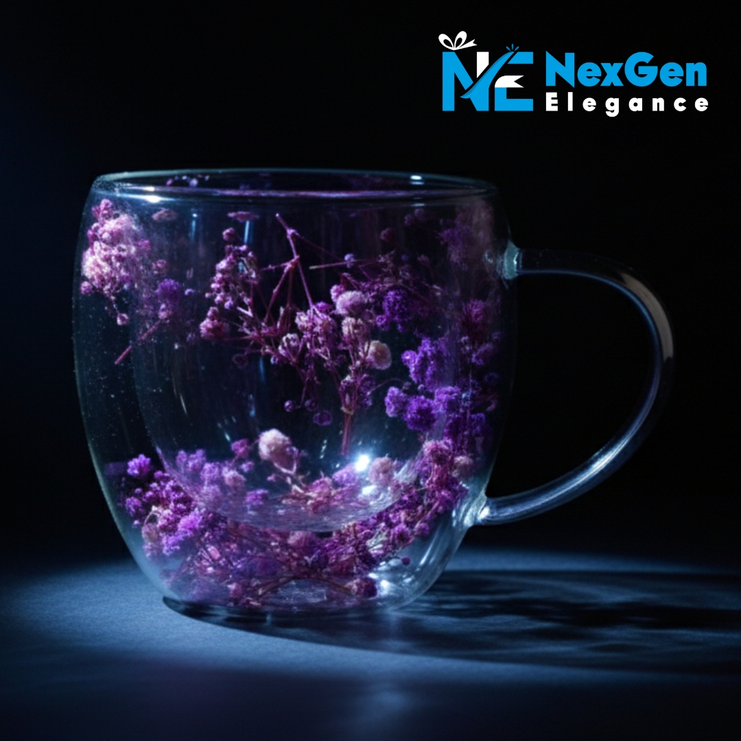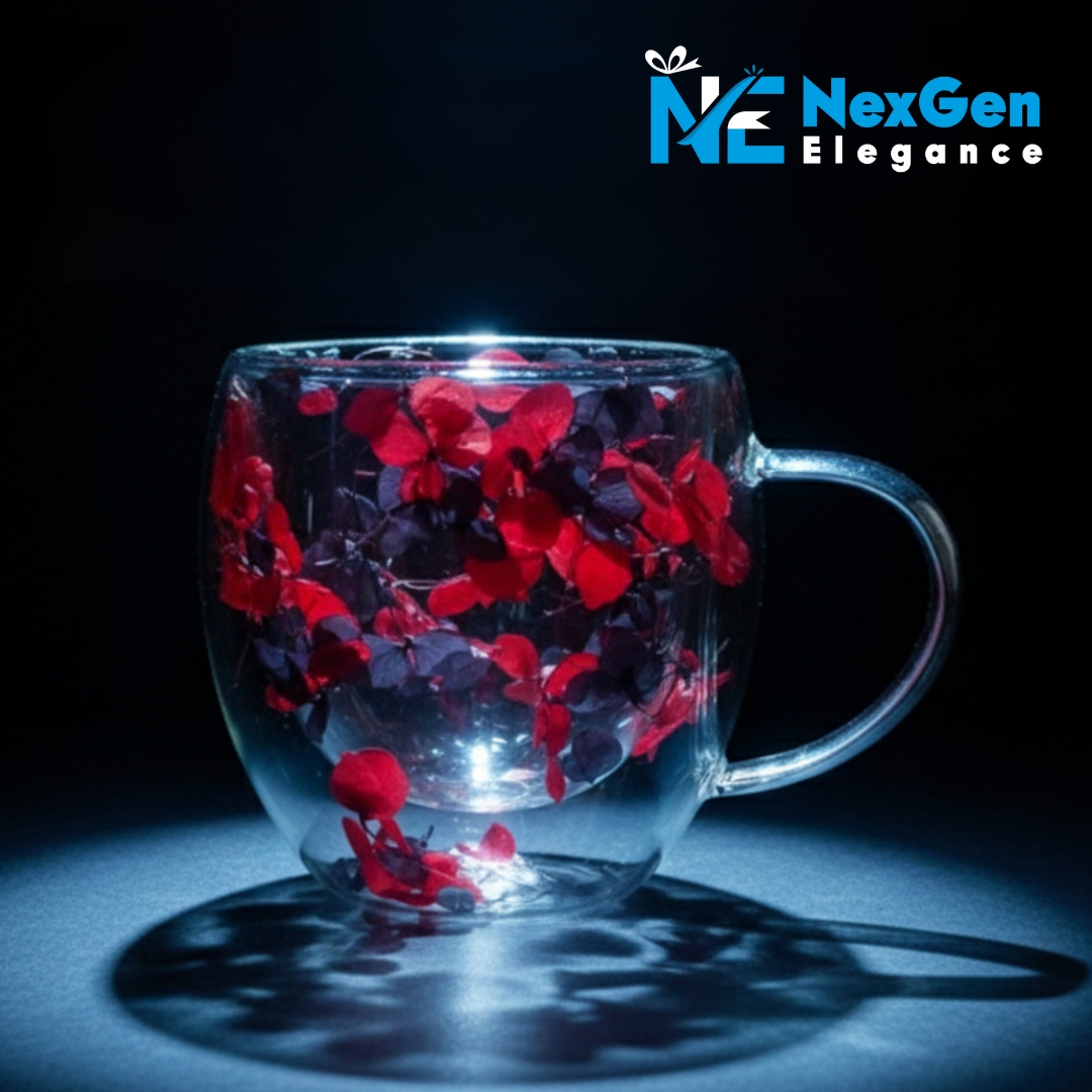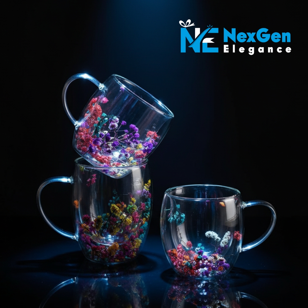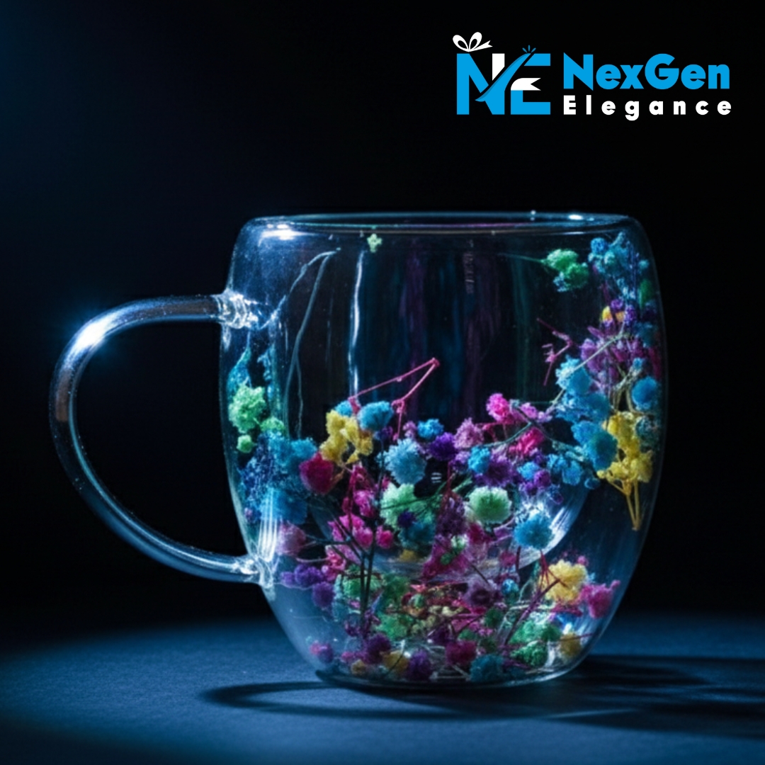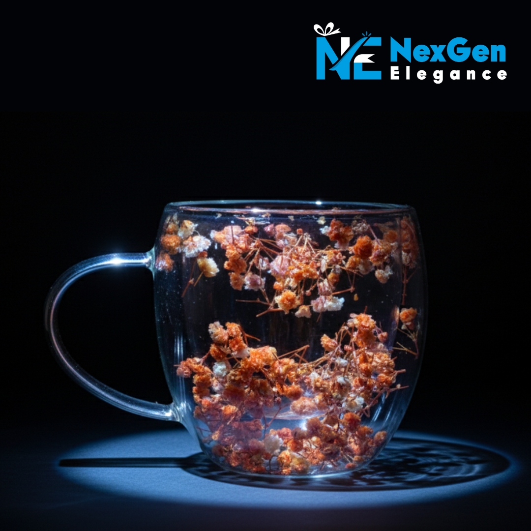 অনবদ্য ডিজাইন: স্বচ্ছ কাঁচের ভেতরে রঙিন ফুল ও পাপড়ির সাজসজ্জা একে সাধারণ মগ থেকে আলাদা করেছে। এটি আপনার ডাইনিং টেবিল বা অফিসের ডেস্কের সৌন্দর্য বহুগুণ বাড়িয়ে দেবে।